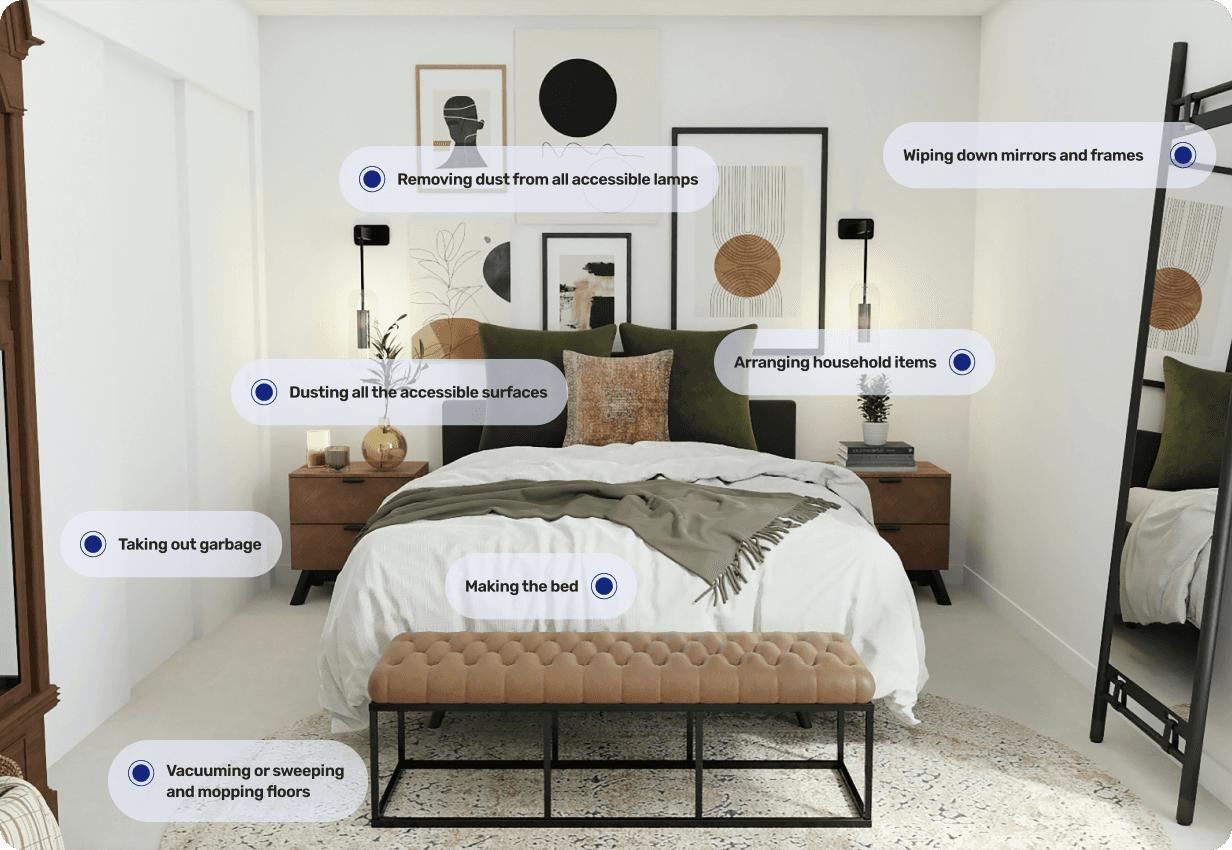 - Cleaning of high or hard-to-reach areas (e.g., ceiling fans or light fixtures)